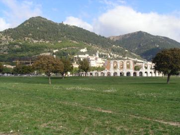 7. oktoberWakker geluid door de klokken. We ontbijten met wat we nog hebben en gaan dan op weg naar Gubbio. Onderweg kopen we een brood. De rit naar Gubbio is erg mooi. Je rijdt door de bergen en het uitzicht is prachtig. In Gubbio is een echte camperplaats. Goed aangegeven in het dorp en goed verzorgd. We lopen ’s morgens te voet naar het stadje (is ongeveer 20 minuten lopen) en vragen informatie bij de VVV. Het museum sluit om 13.00 uur. We hebben te weinig tijd om goed te kijken dus gaan we eerst eten in de camper en komen terug. Het stadje is opgebouwd volgens het Romeinse model, dus rechte straten en zijstraten. Heel anders dan we eergisteren in Spello zagen. Voor de stad liggen de overblijfselen van een Romeins theater.